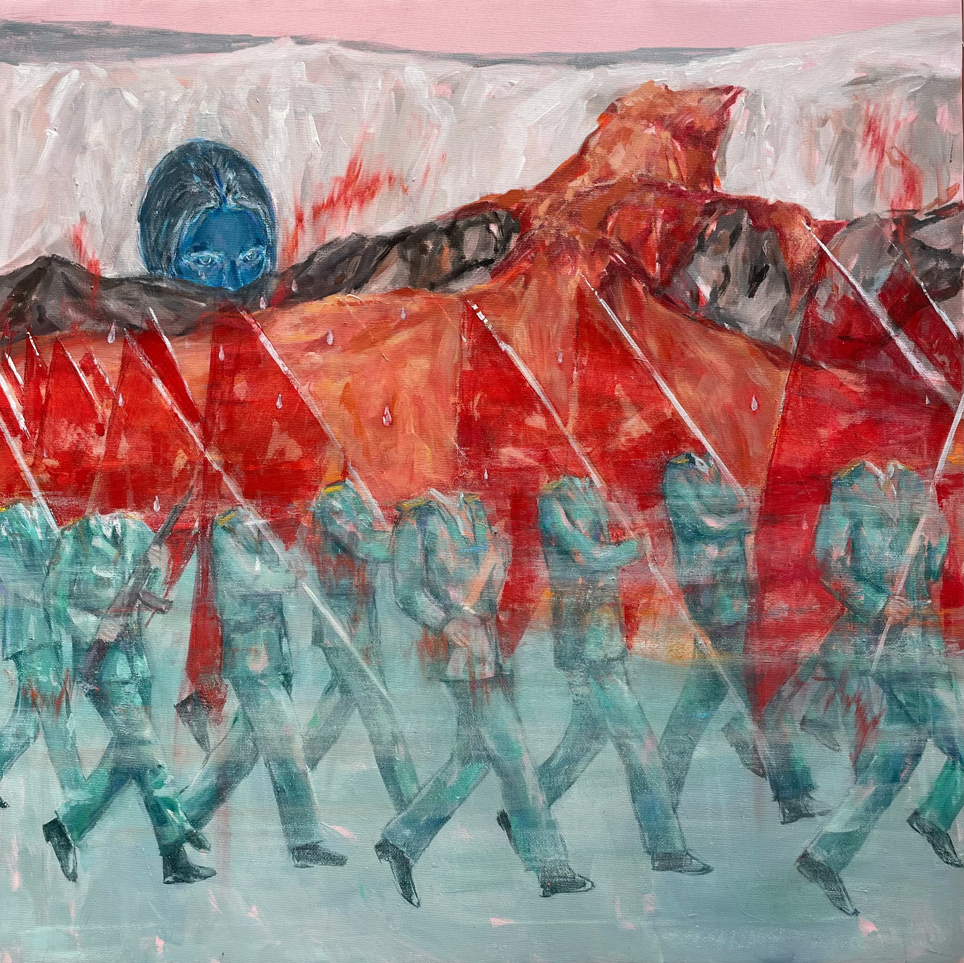 Moving through unstable landscapes, the figures carry what remains, where the personal and the collective merge.
